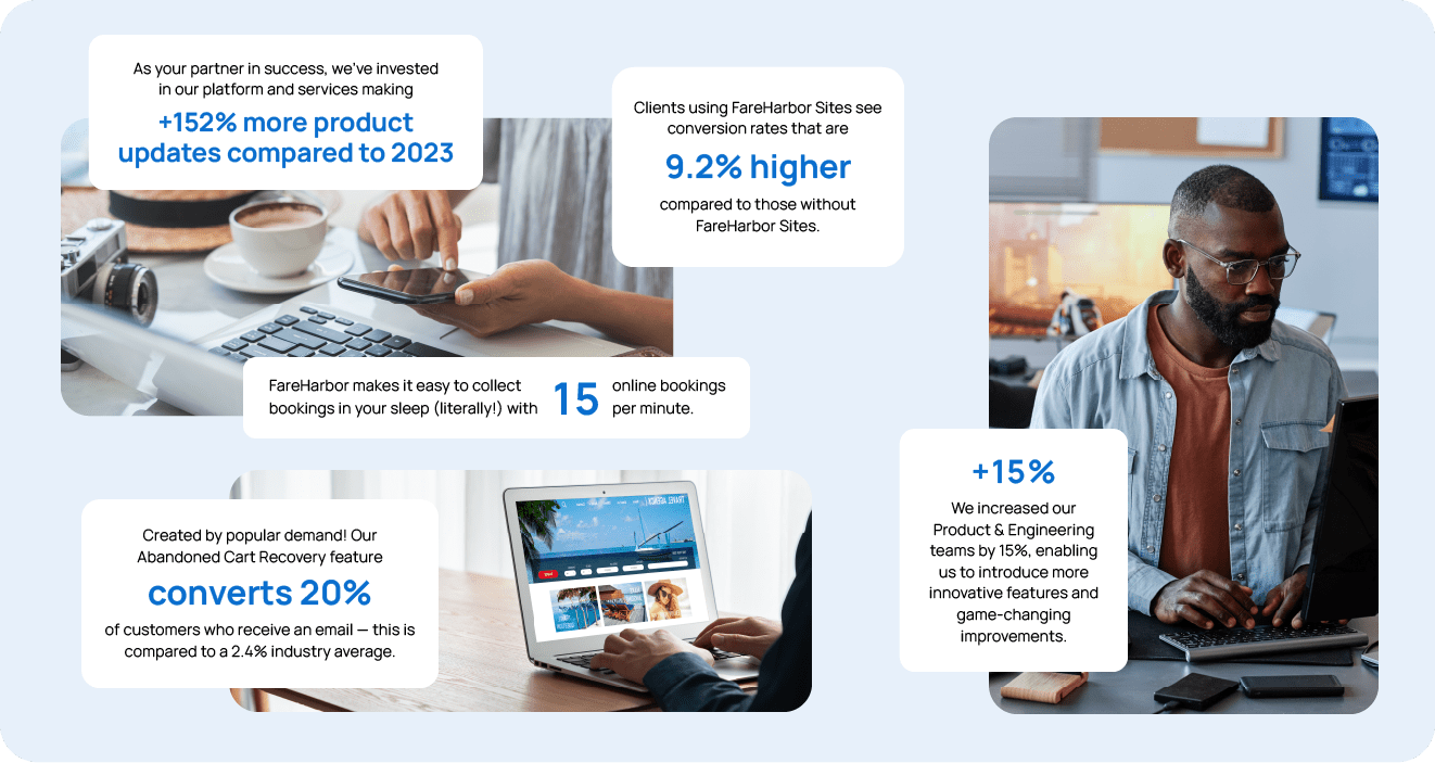 FareHarbor entered 2024 with a focus on innovation, collaboration, and growth. While we anticipated the ever-changing tides of the travel industry, we didn’t make updates to our product or teams just for the sake of change. Every decision, every update, and every interaction had a single purpose: to make experiences better for everyone.